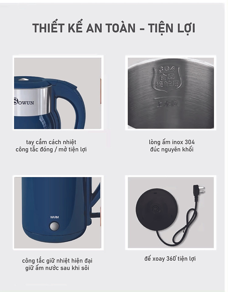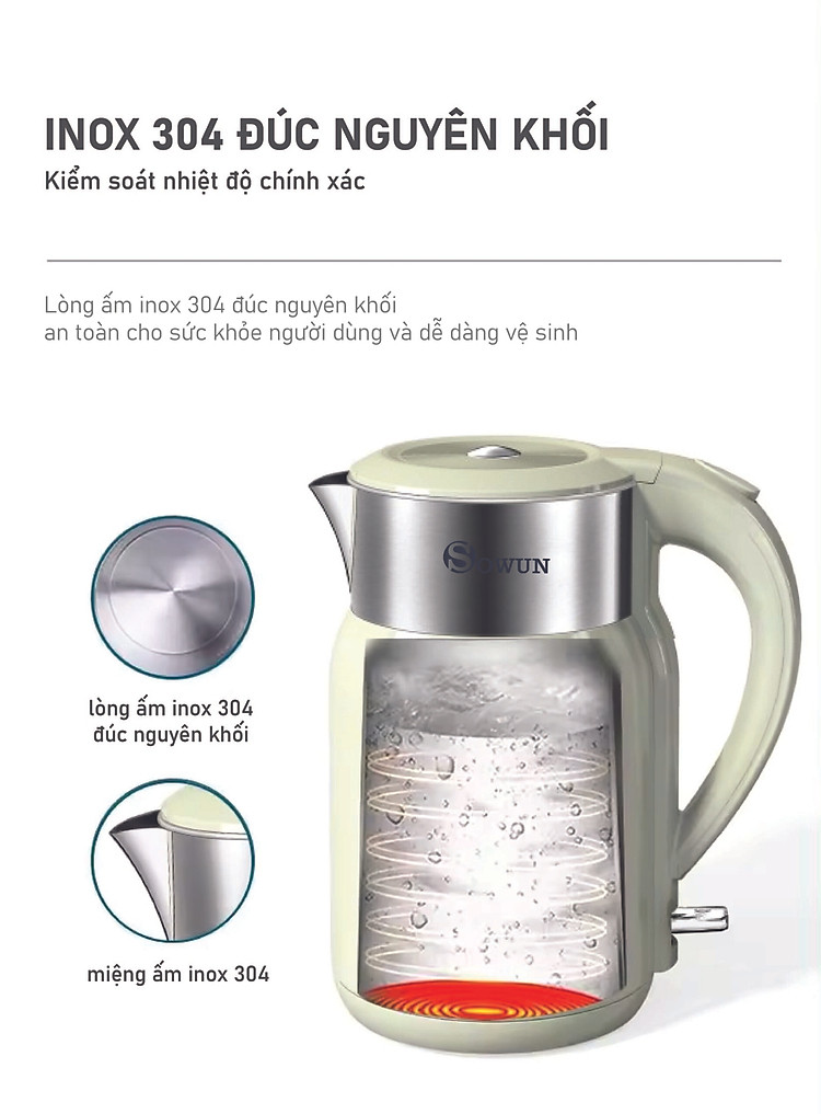 Ấm điện siêu tốc Sowun SW 1601 thiết kế lòng theo dạng nguyên khối nên dễ dàng vệ sinh, hạn chế đóng cặn hoặc rò rỉ nước . Đặc biệt đáy ấm được dập sâu bằng inox SUS 304 chống rò rỉ tuyệt đối khi đun, đảm bảo an toàn rất nhiều năm