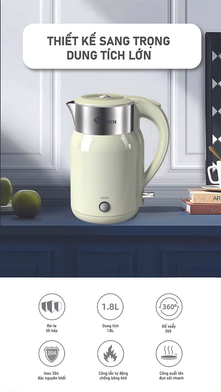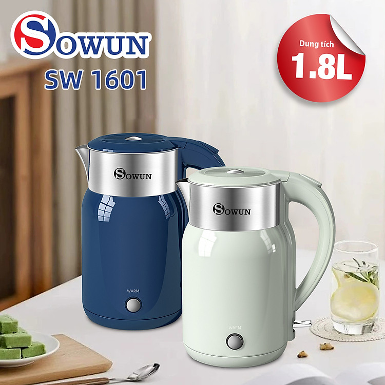 Nổi bật với thiết kế hiện đại và màu sắc trang nhã, Ấm siêu tốc Sowun SW 1601 là sự lựa chọn phù hợp cho những căn bếp hiện đại. Ấm có dung tích lớn 1.8 lít cùng công suất hoạt động cao (1800W) giúp việc đun nước nhanh chóng hơn, tiết kiệm thời gian và điện năng tối đa.