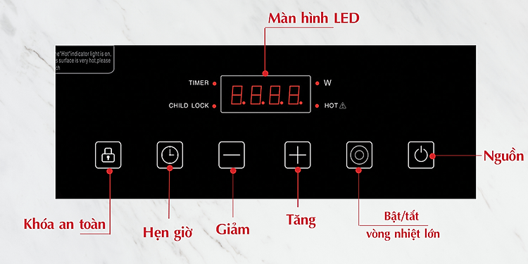 Cảnh báo nhiệt dư: Sau khi sử dụng, nếu vùng nấu mặt bếp còn nóng, màn hình LED sẽ sáng đèn chữ HOT để cảnh báo để người dùng không chạm tay vào mặt bếp gây bỏng.