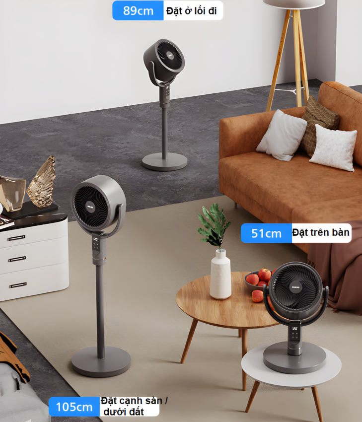 - Tác dụng sử dụng của quạt tuần hoàn không khí: Dùng chung với điều hòa, Dùng với máy sưởi, Làm thông thoáng phòng kín, Làm khô phòng, Phù hợp nhà có trẻ nhỏ/người già.