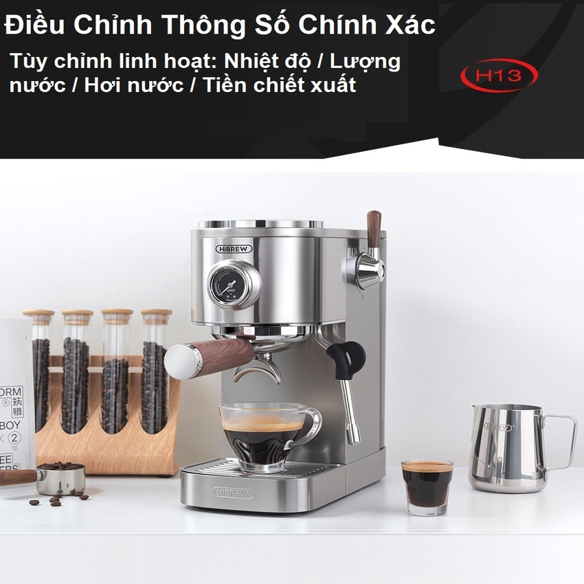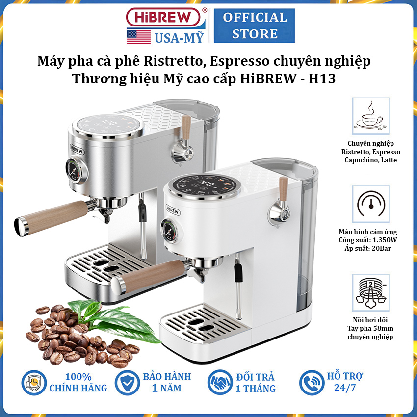 - Máy pha cà phê espresso bán tự động cao cấp HiBREW H13 là dòng máy pha cà phê bán tự động có khả năng pha chế thành nhiều loại cà phê thơm ngon khác nhau như Espresso, Ristretto, Capuchino, Latte ...
