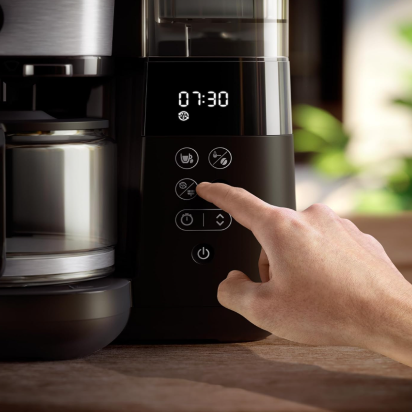 - Màn hình LED hiển thị chế độ pha cà phê có hẹn giờ. Lập trình thời gian để máy pha cà phê tự động khởi động, giúp bạn thức dậy với hương thơm cà phê tươi ngon.