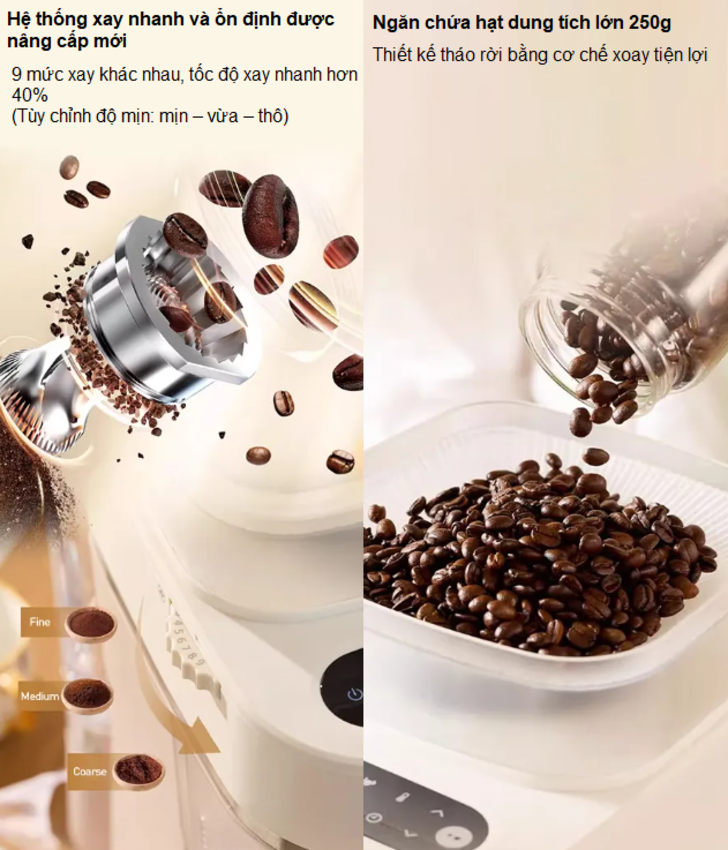 Cung cấp 9 cấp độ xay khác nhau, dễ dàng cá nhân hóa hương vị cà phê: Xay mịn hơn cho cà phê đậm và dày, xay thô hơn cho hương vị thanh nhẹ, trôi chảy.