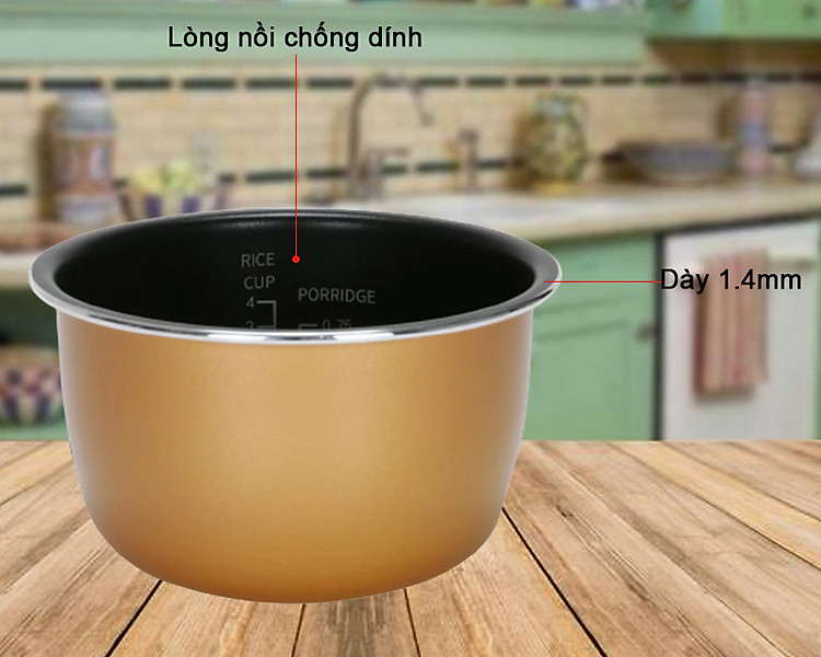 Lòng nồi chống dính dày 1.4mm giúp cơm chín đều, thơm ngon và giữ trọn chất dinh dưỡng có trong hạt gạo.