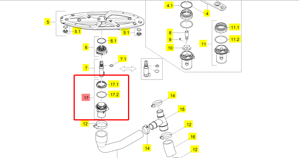Phụ tùng này có chức năng dẫn và phân phối nước rửa và tráng đến trường rửa ( tay phun rửa) để phun xịt lên bề mặt bát đĩa bẩn.
