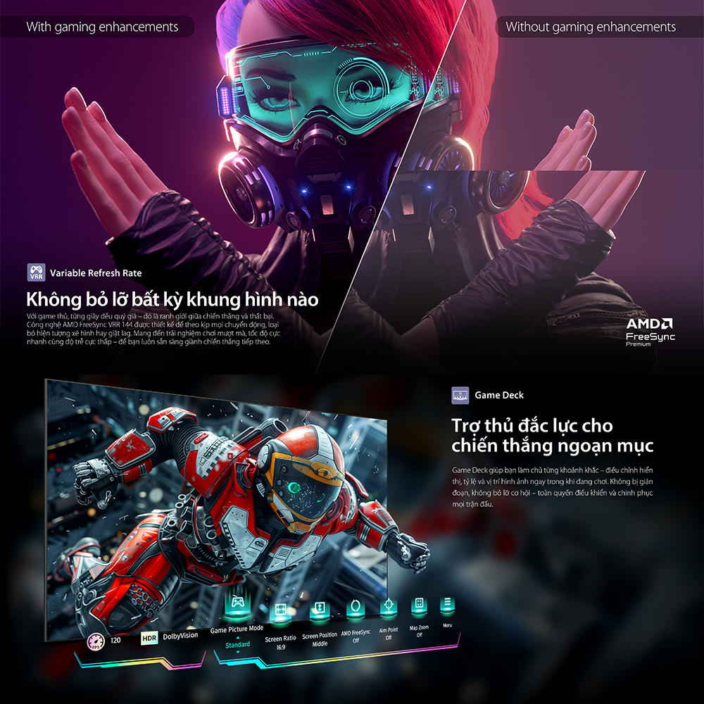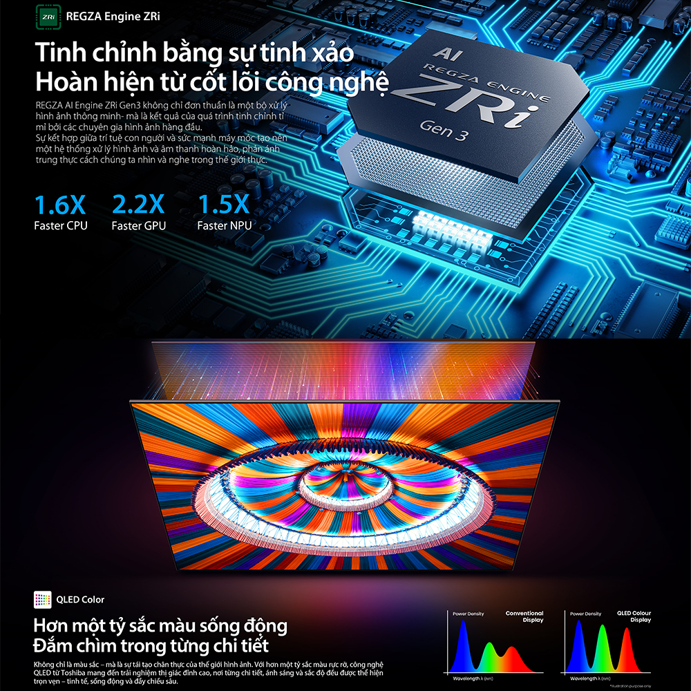 | Công nghệ xử lý hình ảnh | Chấm lượng tử - Quantum Dot Color, REGZA Engine ZRi, AI Picture Optimizer, AI 4K Clarity, AI Motion Enhancer, Đồng bộ khung hình/tần số quét chơi game VRR |
