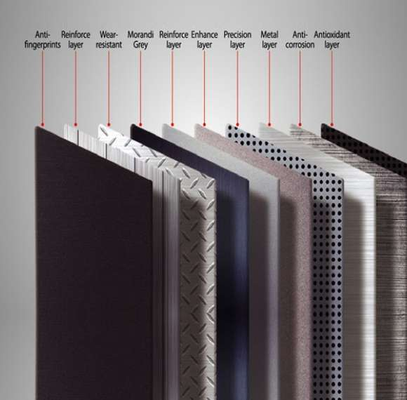 Tủ lạnh có cấu tạo tới 10 lớp vật liệu với đường vân kim loại vô cùng tinh tế. Thiết kế này kết hợp lớp sơn tĩnh điện có khả năng chống bám vân tay và giúp tủ lạnh vẫn luôn sở hữu vẻ ngoài bắt mắt trong thời gian dài.